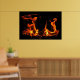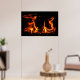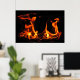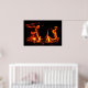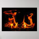 Dieses Poster zeigt die abstrakte Feuerenergie in einem Holzofen. Die Flammen in Orange, Gold und Gelb erscheinen als fröhliche Tanzfiguren. Sie sind von einem schwarzen Hintergrund abgeschnitten.
