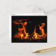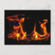 Diese Postkarte zeigt die Feuerkraft in einem Holzofen. Die Flammen in Orange, Gold und Gelb erscheinen als fröhliche Tanzfiguren. Sie sind von einem schwarzen Hintergrund abgeschnitten.
