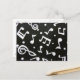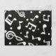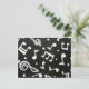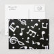 Tiefer schwarzer Hintergrund mit frei fließenden musikalischen Noten bedecken diese trendige Notenkarte mit passendem Schmuck und Herren-Krawatte.