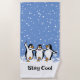Dancing Penguins Design Beach Handtuch mit individualisierbaren Hintergrundfarbe und Text.