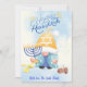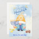 Hermoso diseño de tarjeta de hanukkah con gnomo, menora y otros elementos de la celebración en colores azules, no te quedes sin esa tarjeta que se convertira en detalle perfecto para tus amigos y familiares como prueba de afecto delante te tu familia.