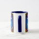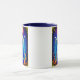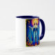 Mug in the tarot card "The Queen of Wands". Standing regally in flowing blue robes, radiant under a golden halo, she holds a wand, symbolizing power and creativity. Surrounded by fiery branches and stars, she exudes confidence, warmth, and spiritual strength