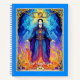 Journal in an illustration of The Magician tarot card symbolizing manifestation, power, and divine connection. Clad in radiant robes and framed by elemental fire and celestial light, he channels energy between heaven and earth. The infinity symbol above represents limitless potential and mastery. He embodies the will to create one’s own reality.