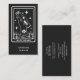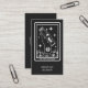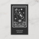 Tarot pet groomer business card in crisp black and white, featuring a hand holding clippers above a small paw print, framed like a tarot card with stars and flowers and the words The Pet Groomer at the base, with your name set in simple modern type beneath the artwork and your phone, email, website, location, and social media icons arranged cleanly on the back so pet salons, mobile groomers, and stylists can share contact details in a look that feels both mystical and professional, easily customized with your own information.