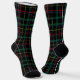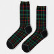 Socks with dark tartan pattern in black, green and red with yellow and blue crisscrossing.