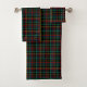 Tartan-patterned towel set with red, green, blue, and yellow stripes. The main image shows towels on a rack; the inset displays a matching washcloth.