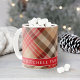 Personalisieren Sie diesen festlichen Weihnachtskaffee oder heiße Kakao-Tasse mit Ihrem Familiennamen und Datum festgelegt (das verheiratete Jahr oder das erste Kind war geboren) oder anderen benutzerdefinierten Text. Das Design zeichnet sich durch ein festliches und stilvolles rotes, bräunliches, beige und braunes kariertes Muster aus.