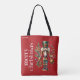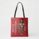 Weihnachts Thema Nutcracker mit Ornament, Frohe Weihnachts-weiße Typografie, und anpassbarer Text auf einem roten Hintergrund.