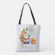 Das ist eine festliche Tasche mit einem fröhlichen Santa mit Geschenken, stehend neben einem wunderschönen, verzierten Weihnachtsbaum.