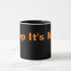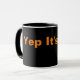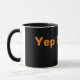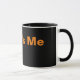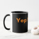 Schwarzer Kaffee Tasse mit orangefarbenem Text.