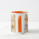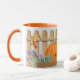 Farbenfrohe Kürbisse in einem Korb mit einem Holzzaun und farbenfrohen Sonnenschirmen. Eine schöne Tasse, um sich mit dem Namen Ihrer Wahl zu personalisieren, perfekt für den Erntedank.