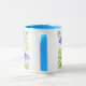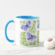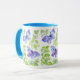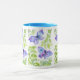 Weiße Tasse mit blauem Griff und Felge, mit Aquarellmalerei von Schmetterlingen