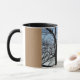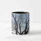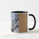 Eine Tasse mit einem Bild eines Baumes und Himmel auf ihm und brauner Boden.
