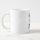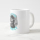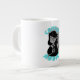 Das Bild zeichnet sich durch ein schlichtes, aber auffälliges Design einer Kaffee-Tasse auf schwarzem Hintergrund aus. Die Tasse hat Dampf, der von ihr aufsteigt, was darauf hindeutet, dass sie mit heißem Kaffee gefüllt ist. Auf der Tasse gibt es eine grafische Abbildung einer Person, die eine Tasse hält, eine Brille trägt und einen Bogen im Haar trägt. Oben und unterhalb dieser Abbildung ist der Text "COFFEE ADDICT" in hellblau geschrieben, der die zentrale Grafik umgibt. Das Design ist sauber, modern und spielerisch ästhetisch.