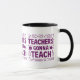 Phantastische Tasse mit dem Zitat "Lehrer werden lehren", umgeben von Schulmaterial
