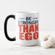 Dieses Design der Tasse enthält einen motivierend Satz: "SEIN STÄRKER ALS EGO", der in fett gedruckten Großbuchstaben angezeigt wird. Das Textlayout verwendet zwei Farben für die Betonung: Die Wörter "BE STRONGER" sind in dunkelmarineblau, während "THAN EGO" in kräftigem Rot ist. Die Typografie ist kühn und bedrückt und verleiht ihr ein robustes und wirkungsvolles Aussehen. Subtile horizontale Linien über und unter "SEIN STRONGER" fügen dem Design Balance und Struktur hinzu. Dieser Stil würde diejenigen ansprechen, die eine bestärkende, minimalistische Ästhetik suchen.