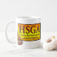 Diese 15 Unze-Tasse hat eine etwas andere Version des HSGA Logos, mit der Gitarre weg zur Seite, wiederholt auf beiden Seiten.
