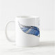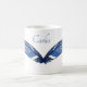 Federn Sie mit blauen Stacheln, die den Schwanz bilden. Zwei Federn kreuzen an der Basis des Kalamus (Welle). Die Spitzen der Federn steigen nach oben nach rechts und werden von der Mitte verlassen. Zwischen den Federn ist der Name, den Sie bearbeiten.