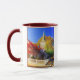 Hochintensives Bild von Herbstbäumen, die eine kleine Stadtkirche mit traditionellem weißen Zaun umgeben.
