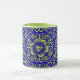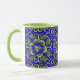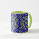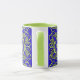 11 g Kaffee Tasse in Blume Medallion motif. Lebhafter, blauer Hintergrund mit Kalkgrün und schwarzem Design in Blume. Kalkgrüner Griff und Interieur.