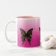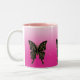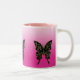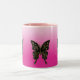 Druck von drei großen schwarzen und goldenen Schmetterling auf einem rosa Farbverlauf Hintergrund.