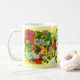Diese farbenfrohe Tasse ist ein Fest für die Augen! Es verfügt über einen informellen Garten mit rosa-weißen Schnappdragons, Nuria in Orange, Gelb und Rot und einer roten Mohn-Blume. Das Originalfoto wurde digital verbessert, um ein abstraktes impressionistisches Muster zu erzeugen.