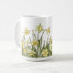 Kaffee Tasse mit Blumenrand von gelben Narzissen auf weißem Hintergrund.