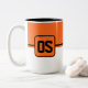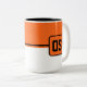 Die Tasse des Kaffees wird hier mit einem farbigen Blockstil-Druck mit einem Beispielbuchstaben gezeigt, die Farben anpassen und ändern und Buchstaben oder kaufen, wie es ist. Farben Schwarz, Orange, Weiß Passen Sie dieses Objekt an oder kaufen Sie, wie es ist.