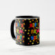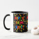 Eine Neujahrskaffee-Tasse mit "Happy New Year" in mehrfarbigen Buchstaben und orange und gelb beginnt auf dem schwarzen Hintergrund verstreut. Von Judy Adamson entwarf eine handbemalte Collage.