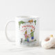 Weiße Tasse mit Kindern schreiben Botschaften der Wertschätzung für ihren Vater an einer Wand. Zwei Katzen schauen sich an.