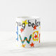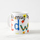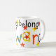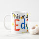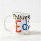 Weiße Tasse mit der Aufschrift "Diese Tasse gehört Edward" in farbenfroher Schrift aus handgemalten Papiersammlungen.