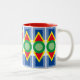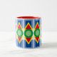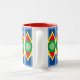 Vertikale Balken aus bunten Formen in jeweils zwei Farben. Platz, dunkelblau mit hellblauer Grenze. Dreieck, rot mit gelbem Rand. Kreis, hellgrün mit dunkelgrüner Grenze.