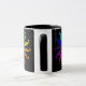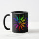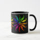 Farbräder. Drei Bilder werden um die Tasse wiederholt, vor einem schwarzen Hintergrund. Die Standardfarben eines Farbrads werden als stilisierte Blätter dargestellt, die von den Stielen in der Mitte zusammengetragen werden. Große Tasse für den visuellen Künstler ***Teil des koordinierten Set - BKM2c.
