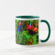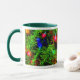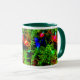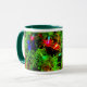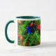 An dieser festlichen saisonalen Tasse leuchten helle Lichter an den Ästen eines Weihnachtsbaumes.