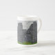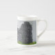 Eine 3D-Szene aus Vue, die den Ort einer alten Schlacht darstellt, mit nur den zerbröckelnden Ruinen eines mittelalterlichen Steinturms und roten Blume im Gras zum Gedenken daran. Der fallende Regen und der weiche Wasserfarbeneffekt verstärken die Traurigkeit der Bergwelt.