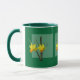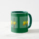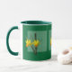 Fotografisches Bild von gelben Narzissen gegen diffuse Quadrate auf dunkelgrünem Hintergrund.