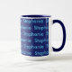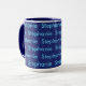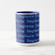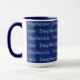Name in hellblau auf dunkelblauem Hintergrund. Personalisieren Sie sich mit dem Namen Ihrer Wahl und es wird in einem gestaffelten "halben Backstein"-Muster gekachelt.