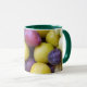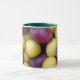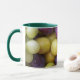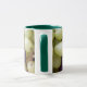 Weiße Tasse mit dunkelgrünem Griff und Felge, verziert mit einem Foto von Herbstfrüchten.