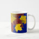 Eine stilvolle, weiße Kaffeemaschine mit einer Collage aus bunten Herbstblättern auf tiefblauem Hintergrund.