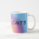 Ich Liebe Katzen - geschrieben in Cat Alphabet Buchstaben. Jeder Buchstabe zeigt eine Katze, die in verschiedenen Positionen gestellt wird. Text vor einem Hintergrund eines bunten Regenbogenarches.