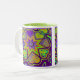 Lebhafte lila, grüne und orangefarbene Herzen und Stars schmücken diese lebendige und hübsche Tasse. Auf diese Weise können Sie Ihren Tisch aufhellen oder morgens mit Ihrem Kaffee geweckt werden. Teil der Sammlung 'Herz voller Liebe'.