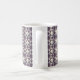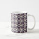 Quiltierter Block in lila-weißem "Spool"-Muster. Acht Sporen drehen sich um eine Mitte dunklen lila. Eine lila Blume ist der "Faden" auf dem Spool. Ohne Rahmen für jeden Block gibt das Muster einen Kaleidoskop-Effekt.