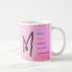 Diese Tasse wird für jeden, von deiner süßen Oma bis hin zu deiner Teenagerschwester, von Beliebtheit sein. Mit der richtigen Botschaft kann eine Tasse für viele Jahre zum wertvollen Begleiter eines jeden werden. Dieses Design zeichnet sich durch einen wunderschönen, handgezeichnet Buchstaben "M" in schwarz kursiv auf einem atemberaubenden Aquarellhintergrund aus. Die links Seite zeigt einen warmen gelb-rosa Farbverlauf, die rechte Seite zeigt einen weichen rosa-gelben Farbverlauf. Um den Brief herum sind lebendige Wörter in verschiedenen Farben, darunter Blau, Orange, Rot, lila und Rosa, die positive Eigenschaften hervorheben, beginnend mit dem Buchstaben "M". Der Gesamteffekt ist ein visuell ansprechendes und aufregendes Design, das die Schönheit des Buchstabens "M" und der damit verbundenen Qualitäten feiert. Der Aquarellhintergrund verleiht dem Ganzen eine Touch von Eleganz und Eleganz und macht es zu einem idealen Design für inspirierende oder motivierend Zwecke.
