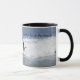 Tasse mit einem Bild von Menschen, die in den Wellen am Strand spielen. Auf der Tasse steht: "Ich möchte lieber am Strand sein".