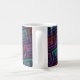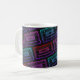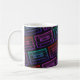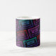 Eine Kaffeemaschine mit neon-Multicolor-Kassettenmuster, die in Rosa, Rot, Blau und lila Farbtönen auf schwarzem Hintergrund eine Kaffeekassette mit Tasse und roten Farbtönen enthält