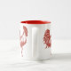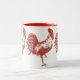 Eine Tasse mit einem roten Hahn.  Die Tasse ist rotes Innere.