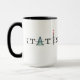 Tasse mit "Statistiker" Logo, das eine Wahrscheinlichkeitsdichtefunktion und drei boxplots mit Bart- und Datenaußenseitern enthält.