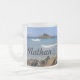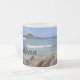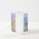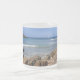 Tasse mit dem Bild des Strandes, der Insel und der Segelboote; aufgenommen in Antigua Barbuda.