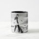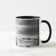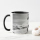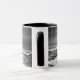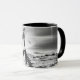 Tasse mit einem Schwarz-Weiß-Bild eines Surfers, der beim Surfen auf den Felsen mit Surfbrett in der Hand zum Surfen aufbricht.