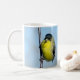 Gelber Vogel mit schwarzem Kopf. Dieser Vogel schnappt sich einen nackten vertikalen Ast und ist bereit, den Tag zu bedienen. Der blaue Himmel bildet den Hintergrund.